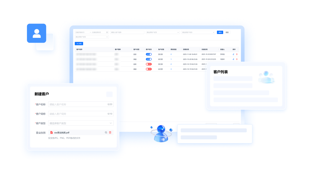 构建多层级客户模型,支持资料审核、到期时间设置与状态管理,不同客户资源隔离互不干扰,满足复杂业务场景下的运营需求。